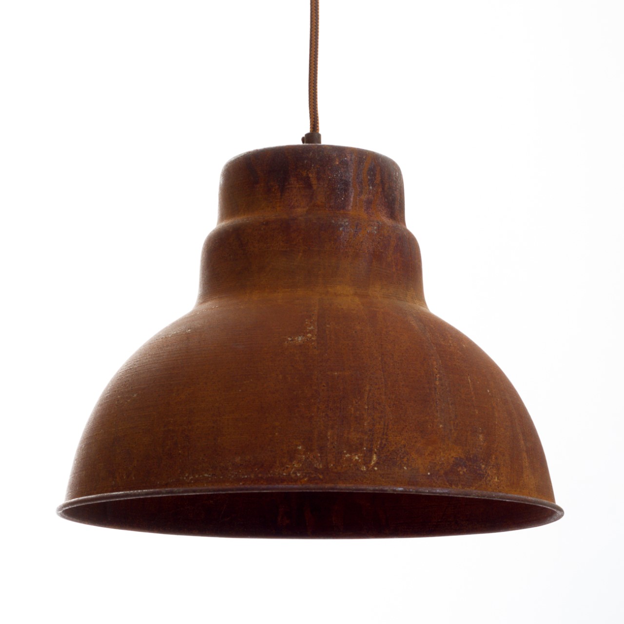 Lámpara fabricada en hierro. Incluye soporte de techo y cable textil. La oxidación es un proceso natural, por este motivo la terminación de la lampara puede variar en color y textura.